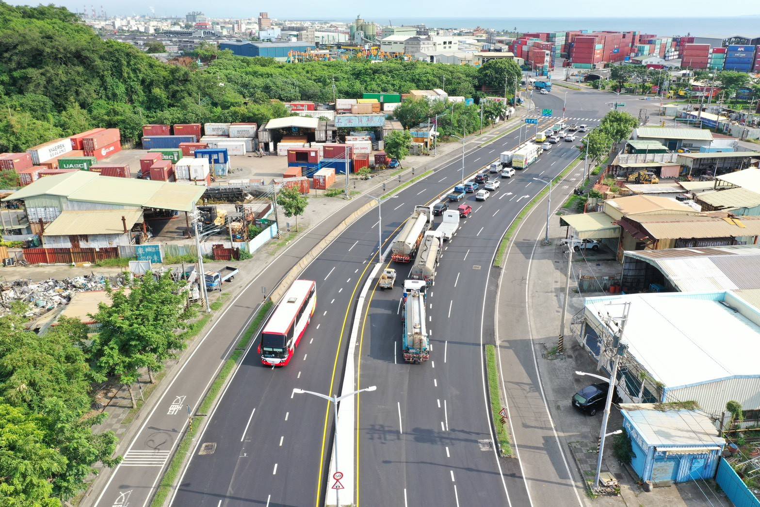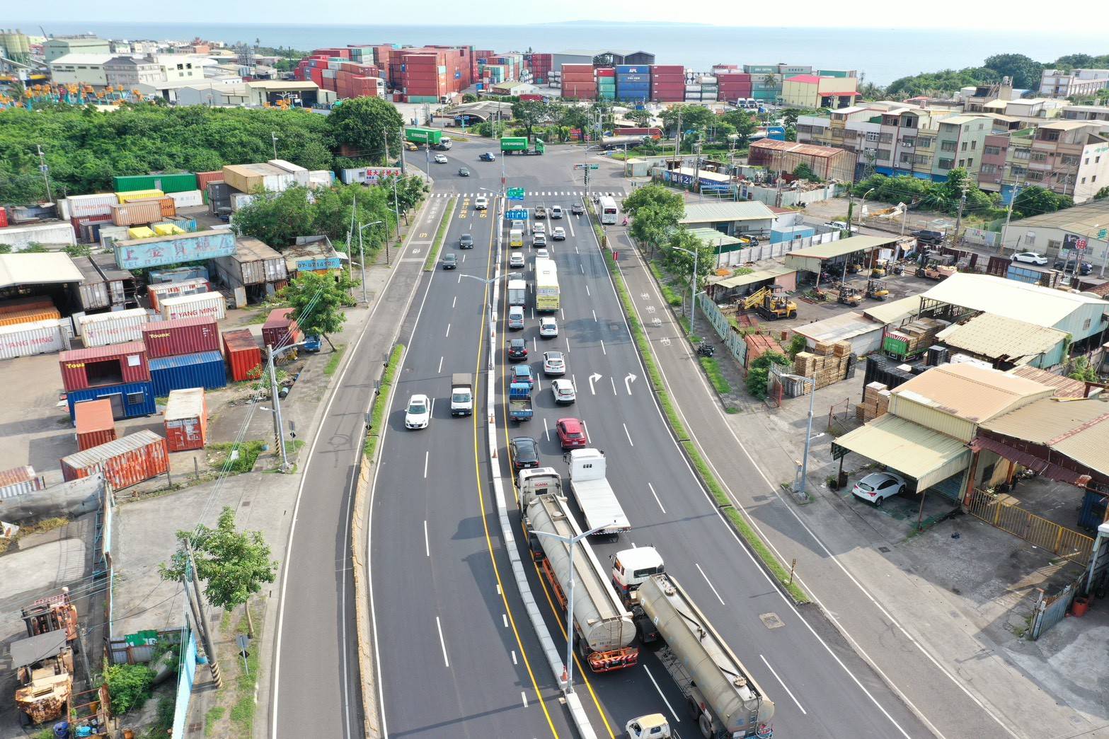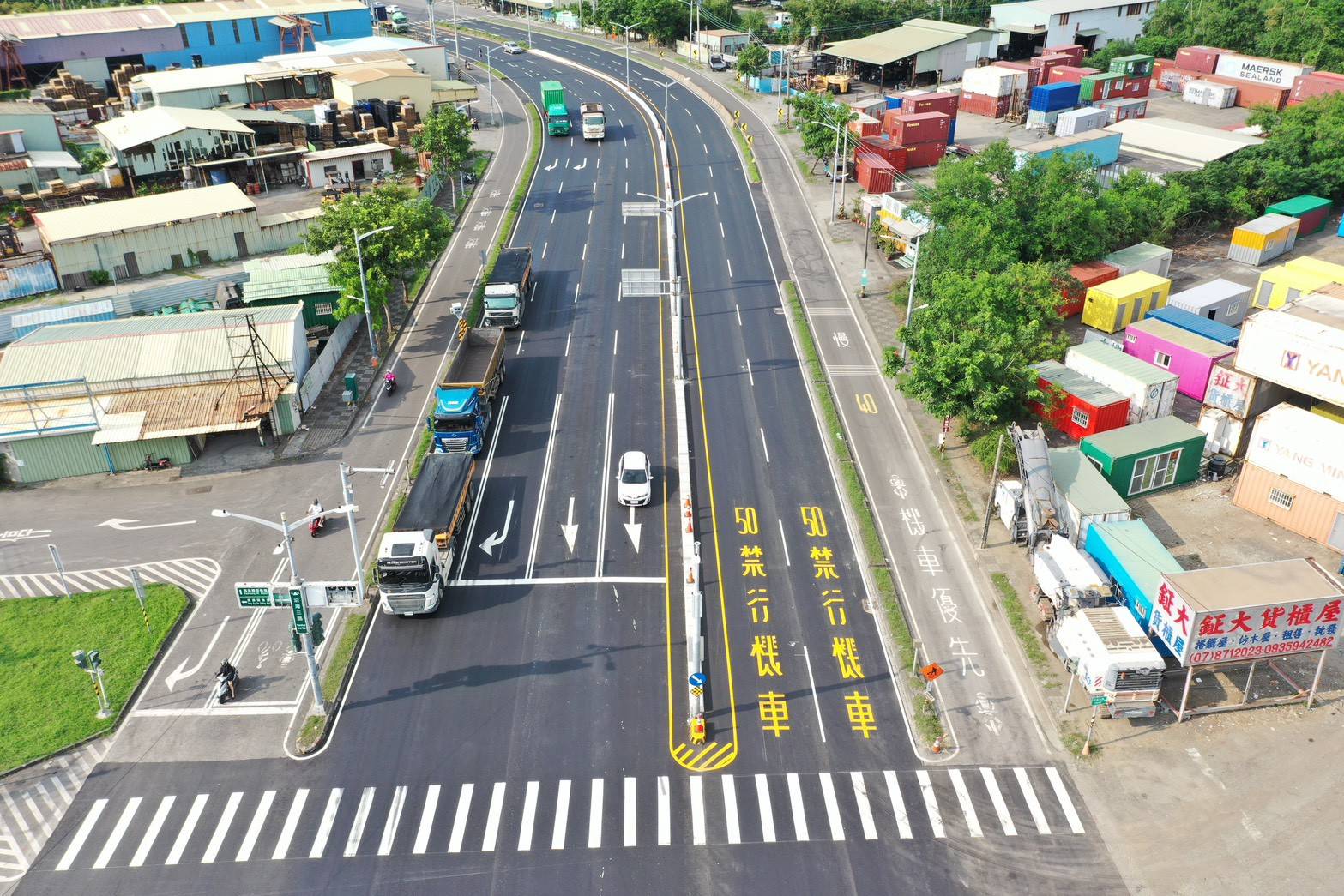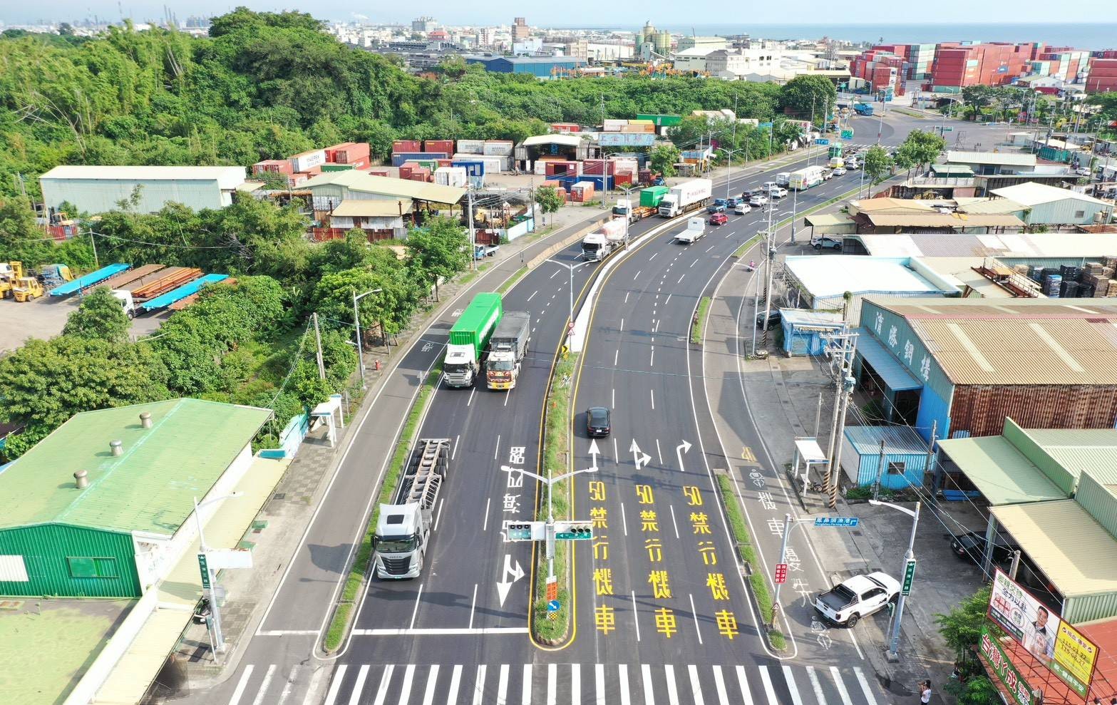 楊欽富表示,洲際貨櫃中心第七貨櫃啟用後帶來可觀的貨櫃車流量,為此,新工處先前辦理沿海路聯外貨櫃專用道開闢工程,並於今年7月全線開通,道工處接續著手改善沿海三路右轉南星路往洲際貨櫃中心車輛回堵問題,透過縮減分隔島寬度並東移,為南下車道騰出空間新增右轉道,原單車道右轉升級為雙車道右轉,進一步提升車流順暢性及產業運輸效能。