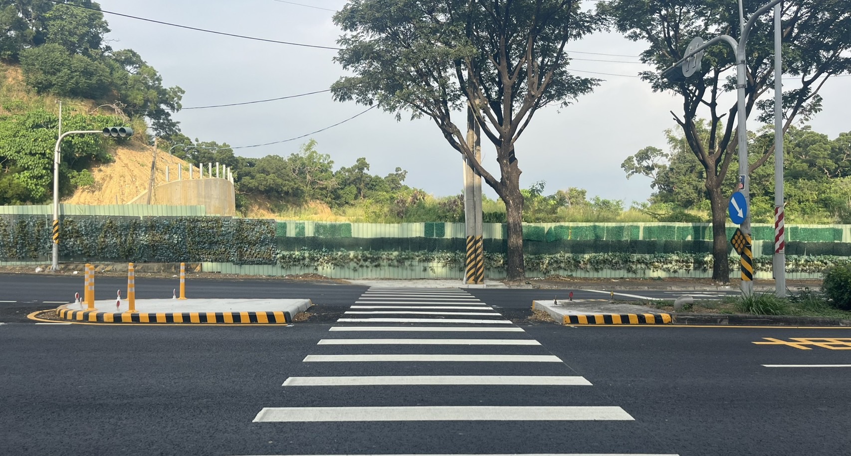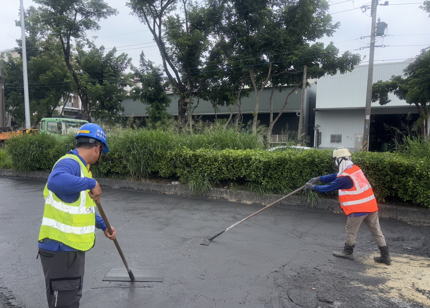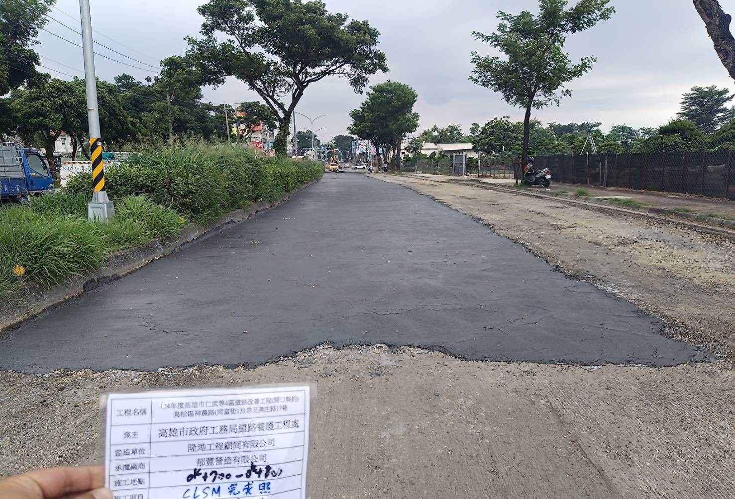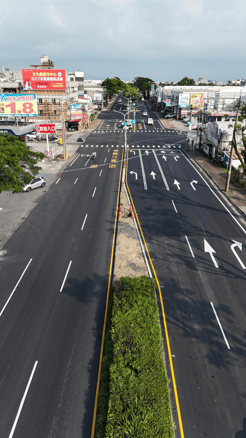 道工處表示,神農路長期交通頻繁且有貨運重型車輛來往,導致路面老化不平。施工前調查路基軟弱部分後重點加強,改善計320公尺長、1,860平方公尺的路基底層,並進行人手孔蓋下地作業,再依地區用路性質,鋪設再生瀝青混凝土,減少碳足跡、提升路面平整度,同步調整分隔島、增設左轉專用道,讓交通更順暢。